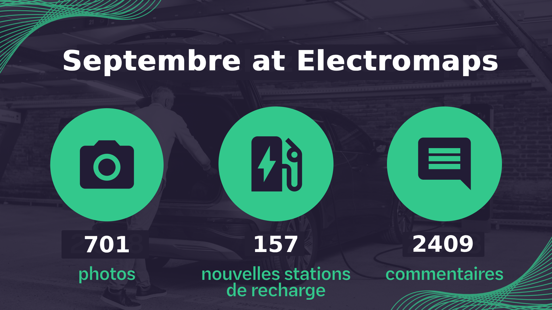 En septembre dernier, notre communauté d'utilisateurs a ajouté 238 stations de recharge à la carte, 2.828 commentaires et 1.051 photos !